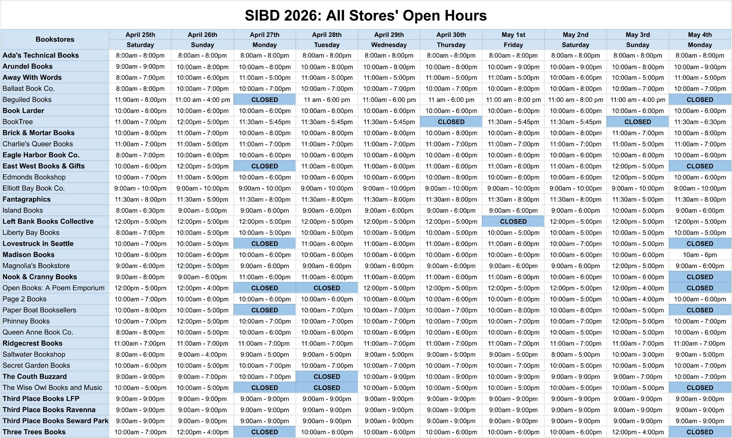 See individual bookstore hours below. Please note that some stores are not open for all ten days of the challenge.